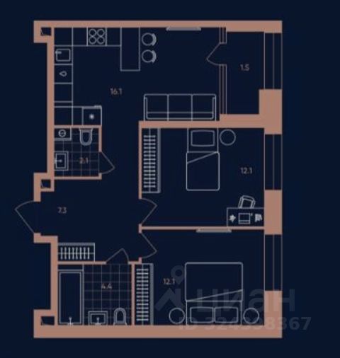 Формат: 3евро (функциональная планировка с просторной кухнейгостиной и двумя изолированными спальнями)