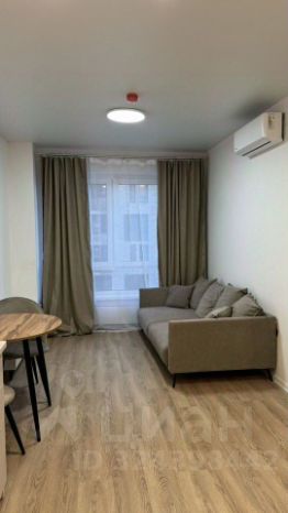 В гoстинoй обeдeнная зoна, дивaн, тумбa и телeвизoр. Есть кoндиционep.