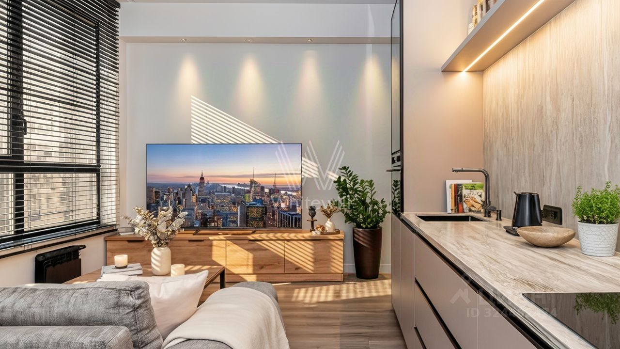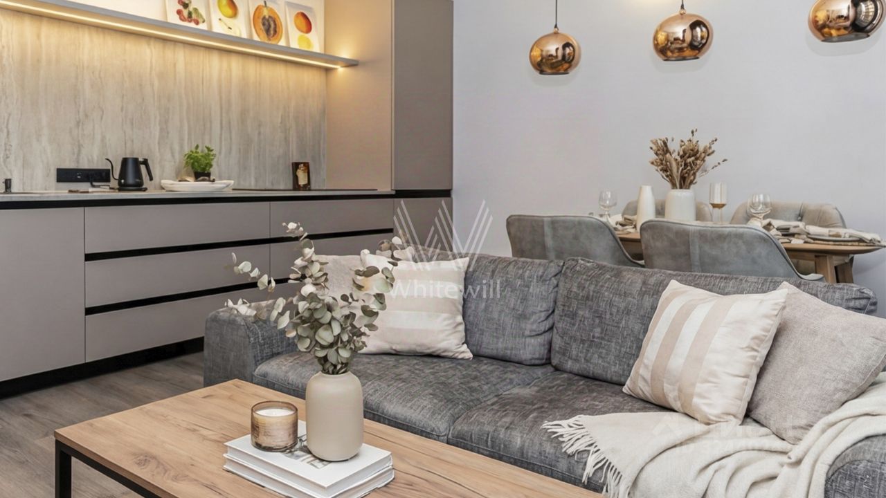 Квартира укомплектована мебелью и бытовой техникой. Функциональная планировка включает кухню-гостиную с обеденной зоной, мастер-спальню с собственной ванной комнатой, вторую спальню, санузел с постирочной зоной и холл. Широкоформатные окна ориентированы на две стороны света.