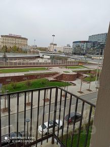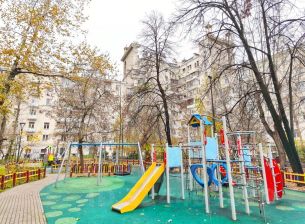 Большой благоустроенный двор с фонтаном, детской площадкой, спортивной площадкой, ландшафтный дизайн. Территория двора огорожена, въезд через шлагбаум. Для жителей есть места, рядом подземный паркинг. Входная группа со свежим ремонтом, лифт с музыкой.
