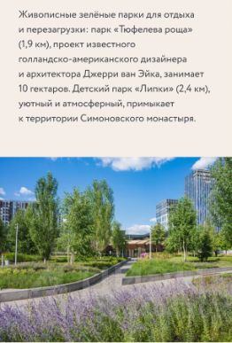 Живописные зелёные парки для отдыха и перезагрузки: парк Тюфелева роща (1,9 км), проект известного голландско - американского дизайнера и архитектора Джерри ван Эйка, занимает 10 гектаров. Детский парк Липки (2,4 км), уютный и атмосферный, примыкает к территории Симоновского монастыря.