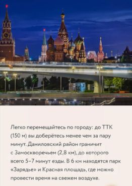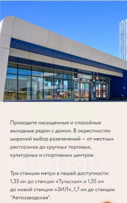 Он соседствует с центром Москвы и обладает своими уникальными достоинствами. Здесь сосредоточены самые современные общественные пространства, культурные учреждения, магазины, развлечения и живописные места для прогулок. Три станции метро в пешей доступности: 1,35 км до станции Тульская и 1,55 км до новой станции ЗИЛ, 1,7 кмдо станции "Автозаводская".