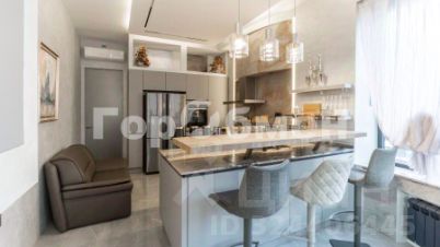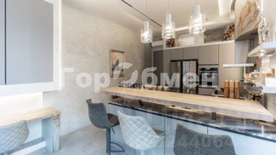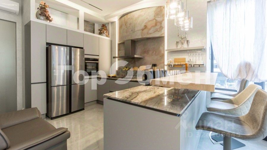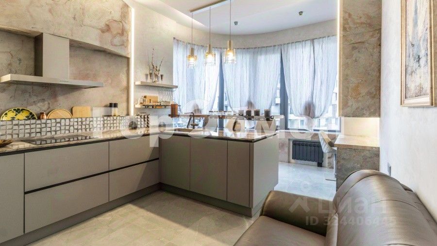 Гостиная: Кухня Hcker (Германия) Премиальная Бытовая техника Neff (Германия): Посудомоечная машина; Индукционная варочная плита; Комбинированный духовой шкаф-пароварка с функцией Су Вид; Вытяжка Falmec Plane Top (Италия) Система мгновенного кипячения InSinkErator AquaHot (США) Измельчитель InSinkErator Evolution ( США) Двухкамерный холодильник SHARP (Япония) Кухонная столешница и подоконники - мрамор Арабескато (Италия), Отделка гостиной, спальни и балкона - натуральным каменным шпоном, декоративная покраска GIOLLI