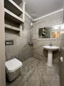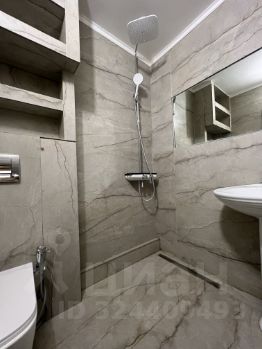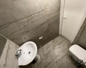 Санузел облицован тем же керамогранитом, оборудован современной сантехникой: тропический душ итальянского производства, гигиенический душ, раковина тюльпан, современный унитаз-инсталляция.