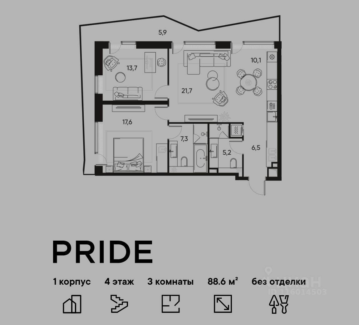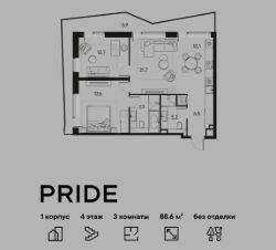 В премиальном жилом квартале PRIDE продается 3-комнатная квартира в 1 корпусе, на 4 этаже, в секции 10. Её общая площадь составляет 88.6 м². Пространство включает 2 уютные спальни 17,6 м², 13,7 м², просторную кухню-гостиную 31,8 м² и 2 ванные комнаты 7,3 м² и 5,2 м². Ключи в 2026 году.