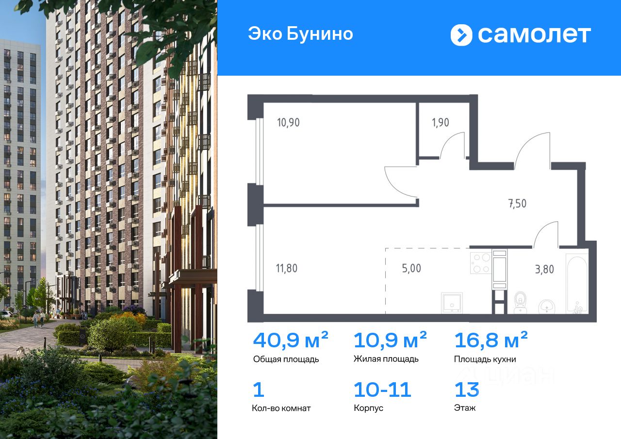 Строим кварталы для жизни с заботой о будущем. Предлагается 1-комнатная квартира комфорт-класса 40,9 кв.м в корпусе 10-11 на 13 этаже, в ЖК "Эко Бунино"