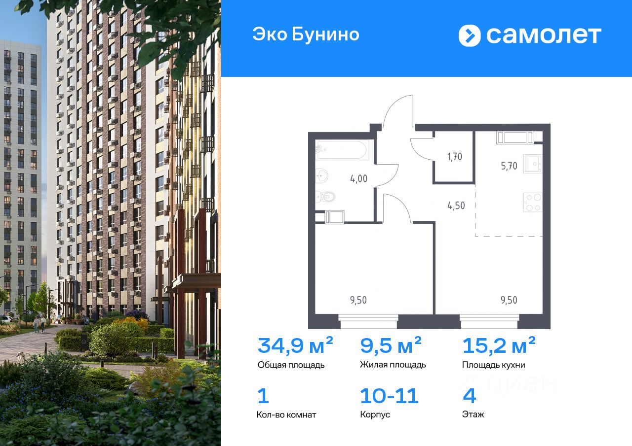 Строим кварталы для жизни с заботой о будущем. Предлагается 1-комнатная квартира комфорт-класса 34,9 кв.м в корпусе 10-11 на 4 этаже, в ЖК "Эко Бунино"
