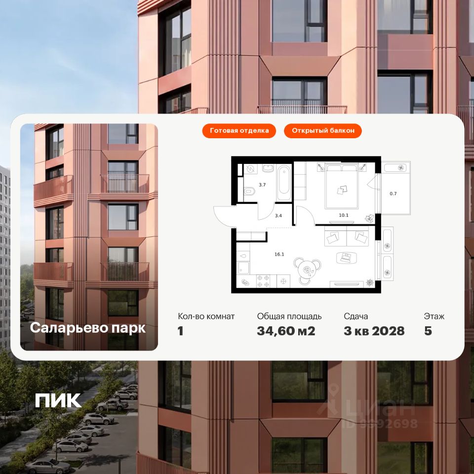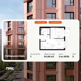 Продаётся 1-комн. квартира площадью 34,6 кв.м на 5 этаже 14 этажного дома (Корпус 69.7, Секция 7) проекта ПИК Саларьево парк. Светлый просторный подъезд на уровне земли, функциональная планировка, большие окна, c отделкой.