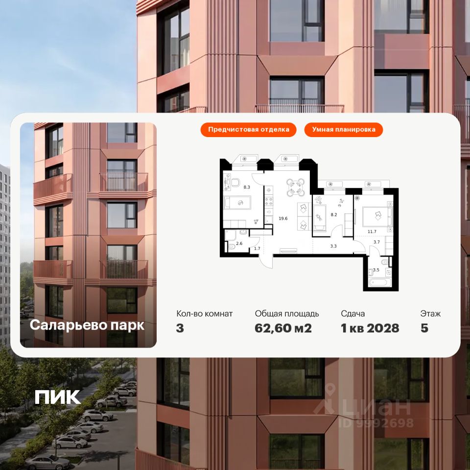 Продаётся 3-комн. квартира площадью 62,6 кв.м на 5 этаже 18 этажного дома (Корпус 74.4, Секция 4) проекта ПИК Саларьево парк. Светлый просторный подъезд на уровне земли, функциональная планировка, большие окна, предчистовая отделка.