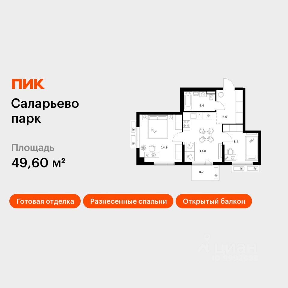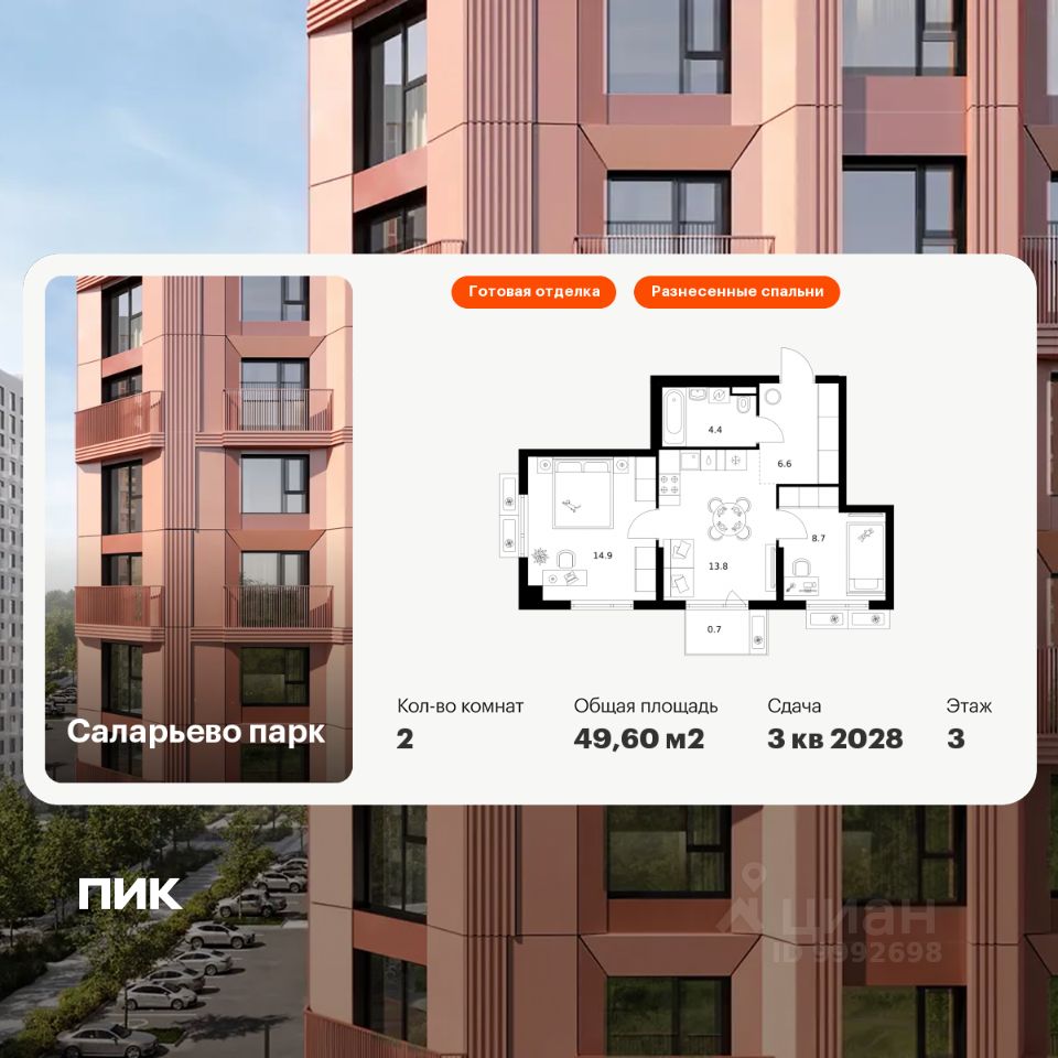 Продаётся 2-комн. квартира площадью 49,6 кв.м на 3 этаже 14 этажного дома (Корпус 69.6, Секция 6) проекта ПИК Саларьево парк. Светлый просторный подъезд на уровне земли, функциональная планировка, большие окна, c отделкой.