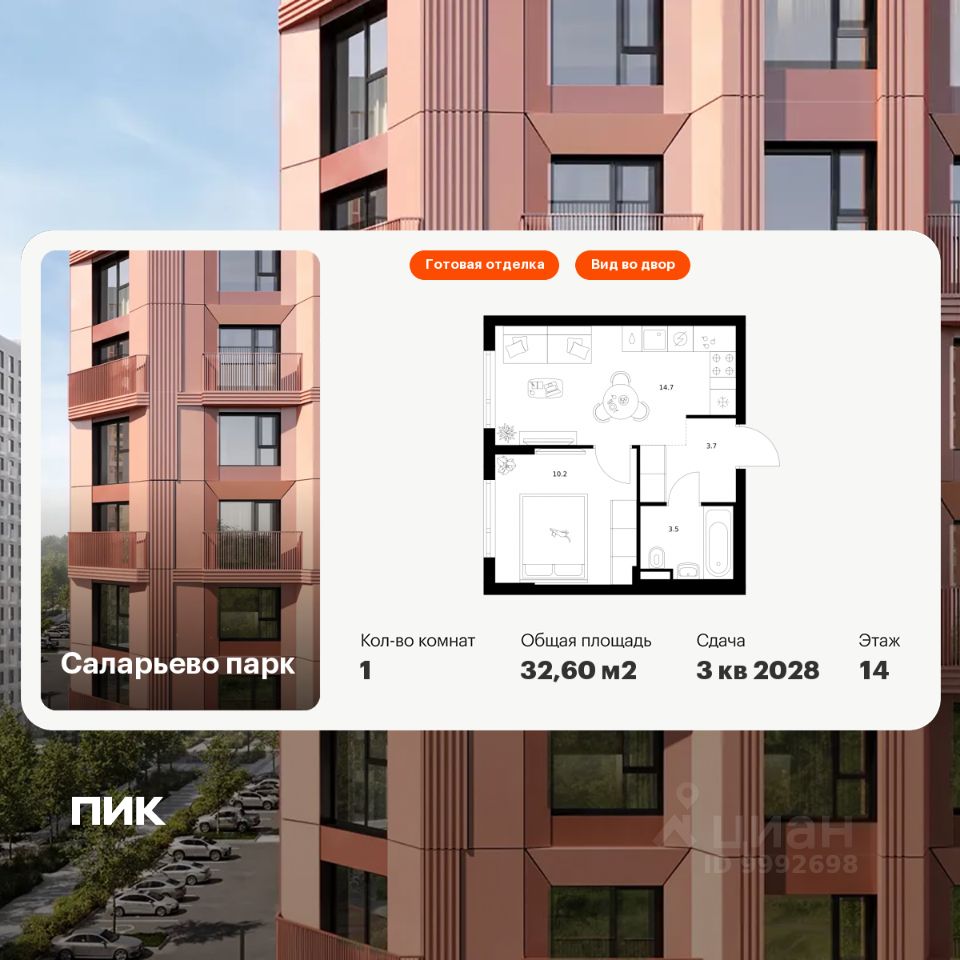 Продаётся 1-комн. квартира площадью 32,6 кв.м на 14 этаже 14 этажного дома (Корпус 69.6, Секция 6) проекта ПИК Саларьево парк. Светлый просторный подъезд на уровне земли, функциональная планировка, большие окна, c отделкой.