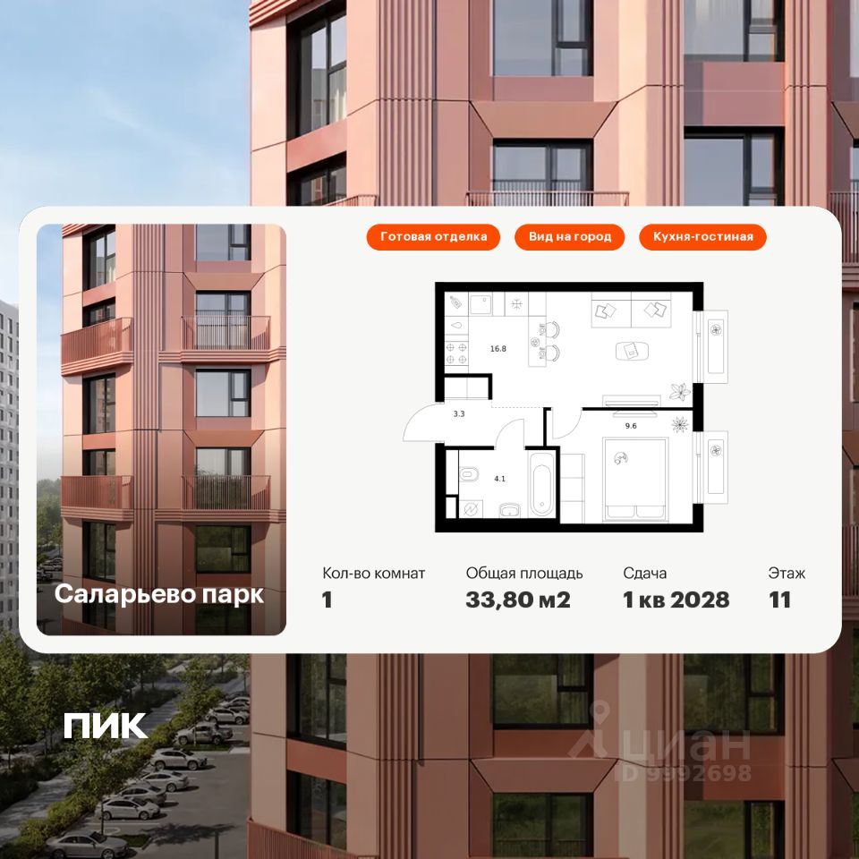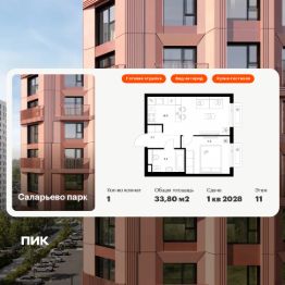 Продаётся 1-комн. квартира площадью 33,8 кв.м на 11 этаже 16 этажного дома (Корпус 74.7, Секция 7) проекта ПИК Саларьево парк. Светлый просторный подъезд на уровне земли, функциональная планировка, большие окна, c отделкой.