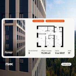 Продаётся 3-комн. квартира площадью 75,9 кв.м на 17 этаже 45 этажного дома (Корпус 1.4, Секция 1) проекта ПИК Полар. Светлый просторный подъезд на уровне земли, функциональная планировка, большие окна, c отделкой.