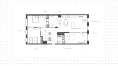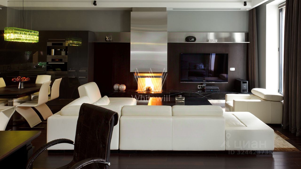 Планировка: просторная гостиная c лаунж-зоной и камином, угловая кухонная зона со встроенной техникой, зона кабинета, 2 спальни, гардеробная, 2 санузла. В кухне-гостиной установлена электрическая перегородка, которая позволяет полностью отделить кабинет. При необходимости его можно использовать отдельно как полноценную комнату. Из панорамных окон открывается вид на улицу и зелёный двор с пышными деревьями.
