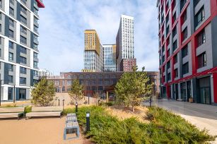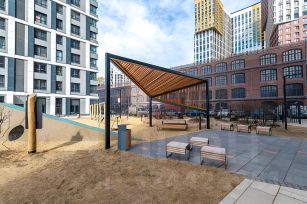 ЖК имеет огороженную, охраняемую территорию, двор без машин, во внутренних дворах красивый, зелёный двор с уникальным ландшафтным дизайном, предусмотрены тематические площадки для детей, прогулочные и велодоржки.
