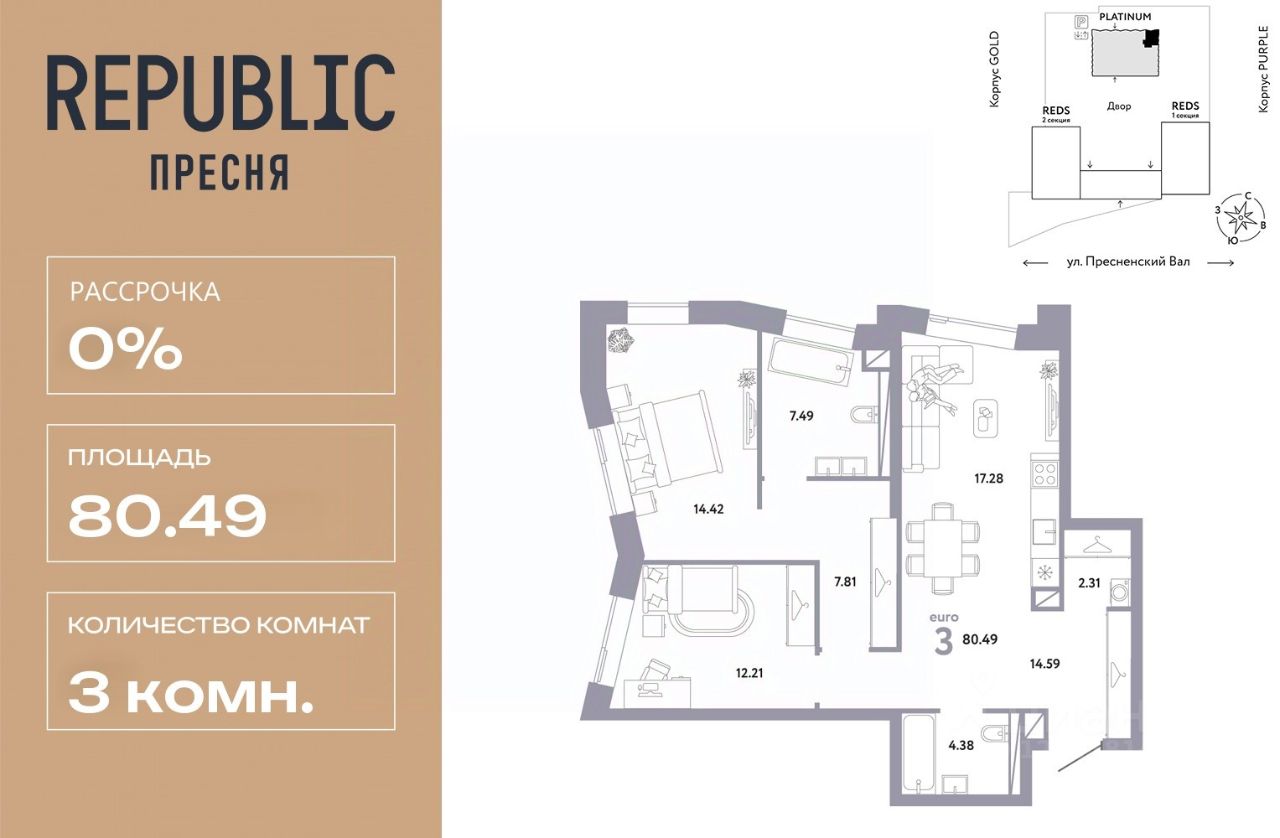 Продается 3комнатная квартира на 8 этаже от застройщика Страна Девелопмент. Площадь квартиры 80,49 кв. м.