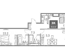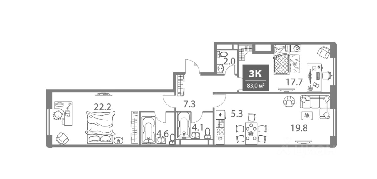 Продаётся 3-х комнатная квартира евро формата с просторной кухней-гостинной, двумя раздельными санузлами, мастер-спальней, и отделкой whitebox: