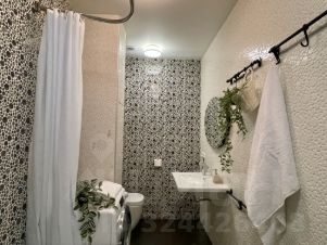 Cанузел отделан дорогой 3D-плиткой, с чугунной ванной Jacob Delafon, раковиной Laufen, бойлером и стиральной машиной.