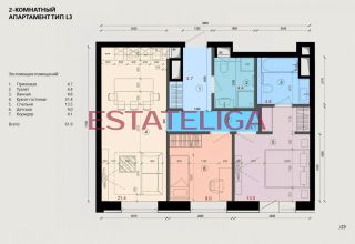 Функциональная планировка апартамента: просторная кухня-гостиная, мастер спальня со своим санузлом, детская комната, первый санузел с ванной в спальне, второй санузел с душем, прихожая. Много мест для хранения - встроенный шкаф с для верхней одежды в коридоре и встроенные шкафы в спальне.