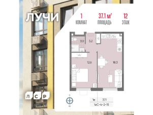 Продается 1-комнатная квартира общей площадью 37.1 кв. метров на 12 этаже жилого комплекса Лучи.