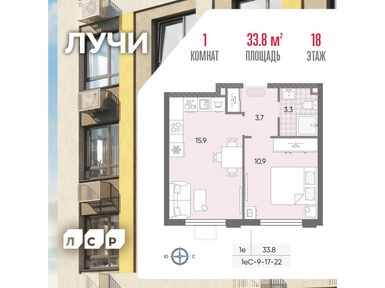 Продается 1-комнатная квартира общей площадью 33.8 кв. метров на 18 этаже жилого комплекса Лучи.