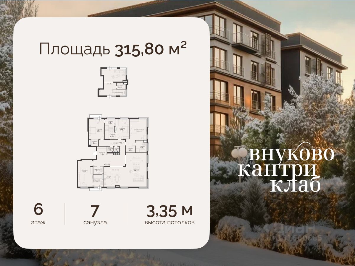 Продается видовая квартира (площадь - 315.80 кв. м., комнат - 4, этаж 6) в клубном поселке премиум-класса Vnukovo Country Club. Комплекс расположен на Западе Москвы в экологически-чистом районе в окружении Ульяновского и Валуевского лесопарков.