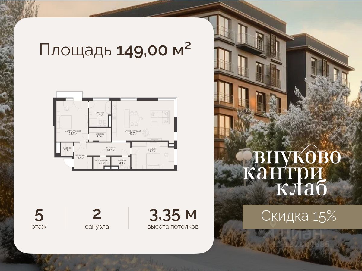 Продается видовая квартира (площадь - 149.00 кв. м., комнат - 4, этаж 5) в клубном поселке премиум-класса Vnukovo Country Club. Комплекс расположен на Западе Москвы в экологически-чистом районе в окружении Ульяновского и Валуевского лесопарков.
