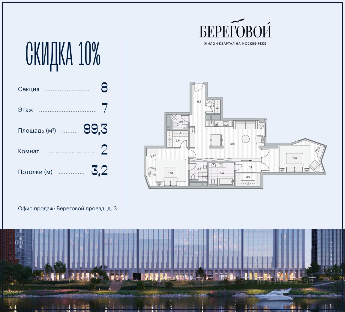 Река. Парк. Сити. Готовый дом в идеальном месте. Продается 2-комнатная квартира на 7 этаже с панорамным остеклением и видом на Береговой пр-д.