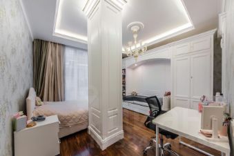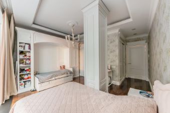 кабинет-гостевая комната с красивыми панорамными окнами имеет вместительную гардеробную. Детская комната полностью меблирована и имеет свою ванную комнату.