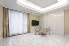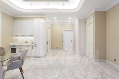 Дизайн интерьера выполнен в элегантном стиле современной классики, где чистота белого гармонично сочетается с уютными бежевыми тонами.