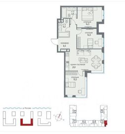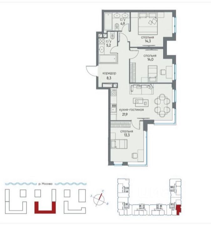Отличная планировка, 2 с/у, кухня-21.9 м2, комнаты- 28.3 м2 и 13.3 м2.