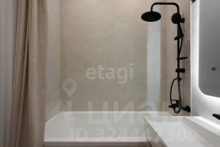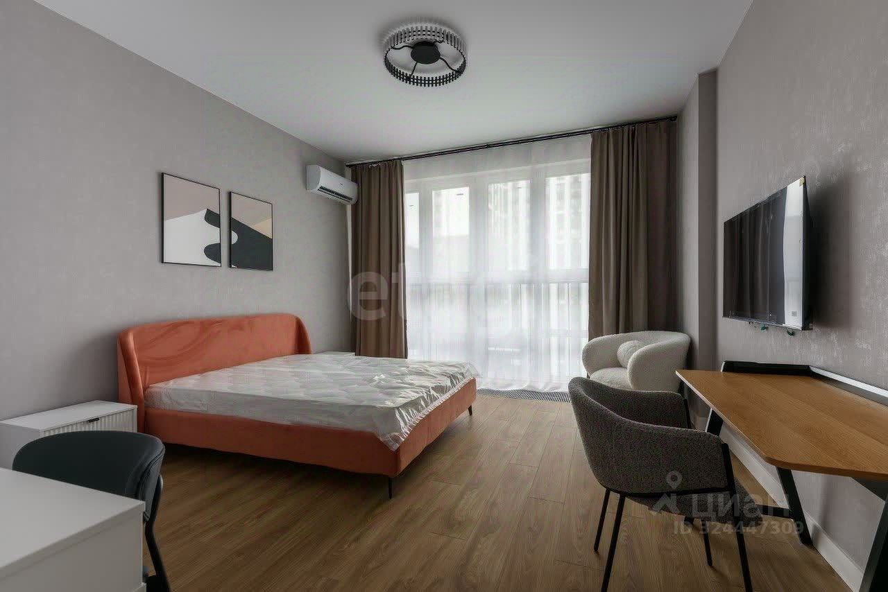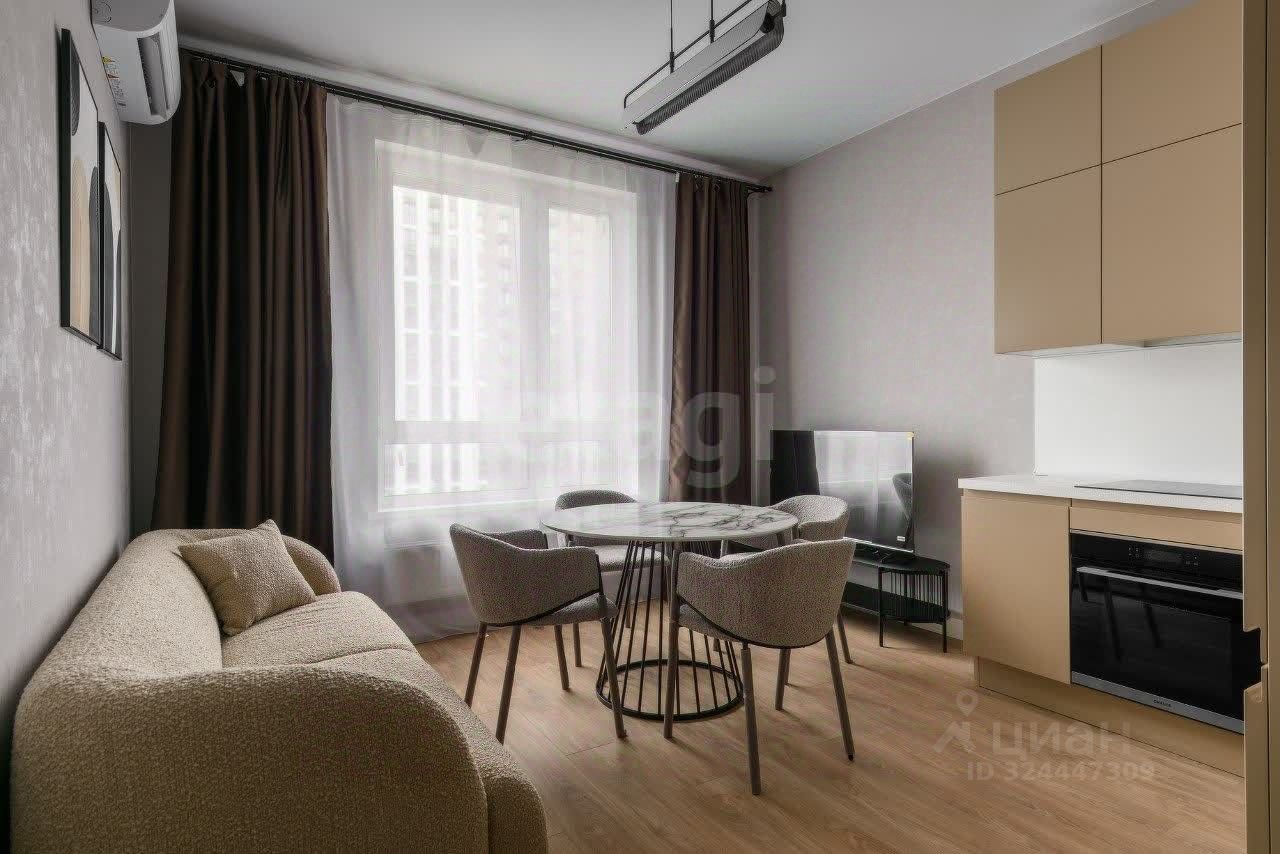 Интерьер выполнен в светлых тонах в стиле современной классики. В просторной кухне-гостиной установлены кухонный гарнитур, обеденная группа и комфортный диван с мягкой обивкой. В отдельной спальне размещены кровать, прикроватные тумбы, рабочий стол и комод с зеркалом. Вся техника также предусмотрена в квартире: духовка, посудомоечная и стиральная машины, холодильник, телевизор. Система хранения в отдельной гардеробной комнате.
