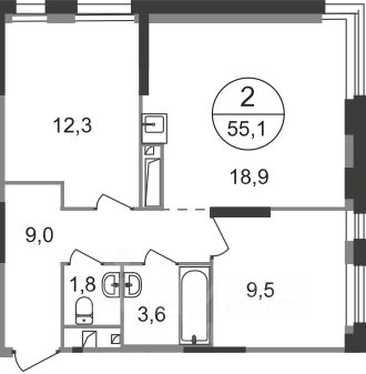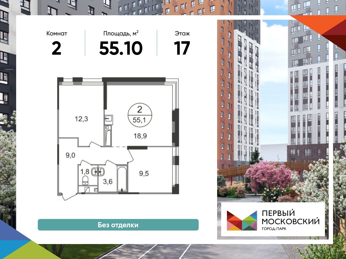 Общая площадь квартиры - 55,1 кв. м, этаж 17 из 19.