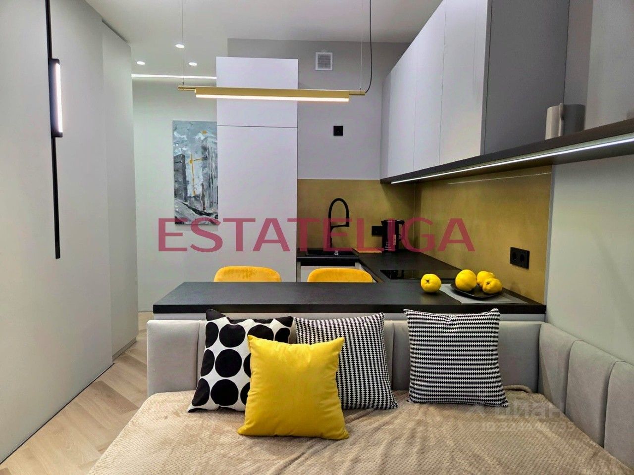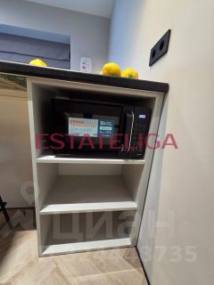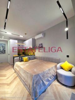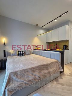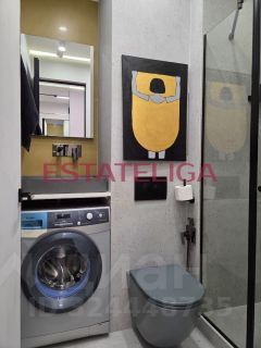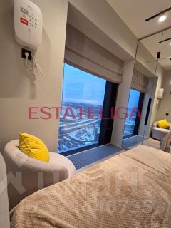 Кухонная зона оборудована всей необходимой техникой: вытяжка, индукционная плита, холодильник, посудомоечная машина, духовой шкаф, микроволновая печь, вместительный шкафчики. В комнате большая, уютная кровать, напротив телевизор, окна в пол! Много мест для хранения - шкафы в пол с зеркальными панелями.