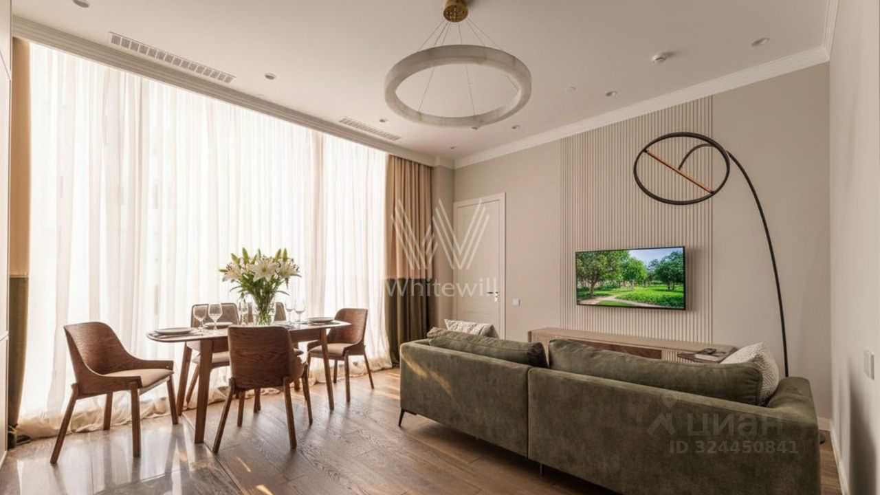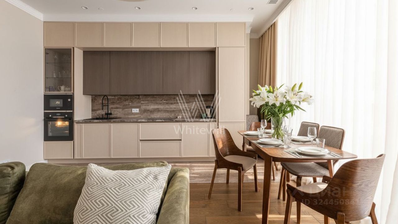 Апартаменты с 2 спальнями общей площадью 88 м² в комплексе премиум-класса "Резиденция Тверская". Апартаменты с отделкой расположены на 6 этаже. Выполнен дизайнерский ремонт в современном стиле в лаконичных светлых тонах. Панорамные окна наполняют пространство естественным светом. Спланирована кухня-гостиная с обеденной зоной, мастер-спальня с собственной ванной комнатой, вторая спальня, гостевой санузел с душевой, гардеробная, прихожая. Апартаменты полностью меблированы и оборудованы бытовой техникой. Окна, ориентированные на две стороны света, открывают виды на город.