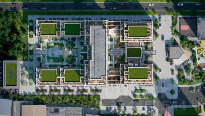 На эксплуатируемых кровлях запроектированы зелёные пространства. В инфраструктуру проекта войдут два павильона с кафетерием и детским клубом, фитнес-студия, ресторан и винотека.