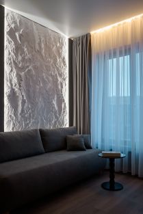 Современный дизайн: спокойные тона, натуральные текстуры, акценты тёплого терракота, продуманное сценарное освещение.