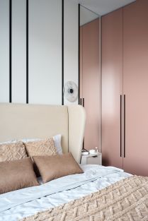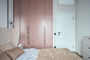 Спальня: кровать Askona, мебель на заказ до потолка, телевизор.