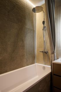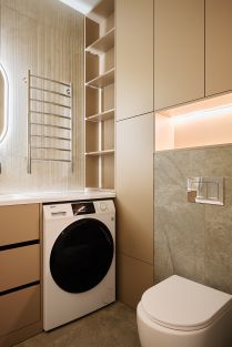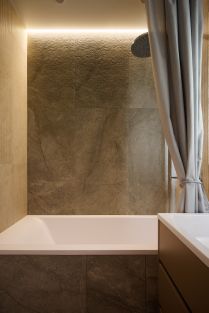 Ванная: тёплый пол, крупноформатный текстурный керамогранит, стирально-сушильная машина, сантехника Bohemia/Tece, ванна из камня.