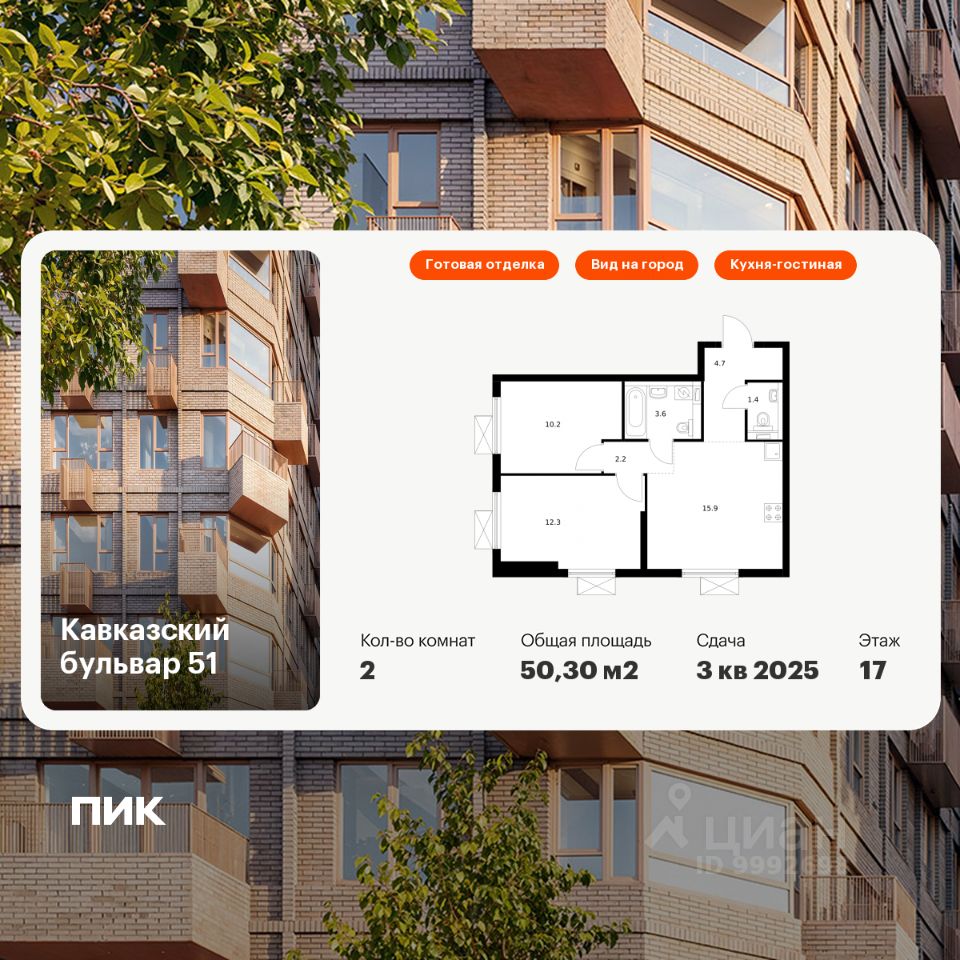 Продаётся 2-комн. квартира площадью 50,3 кв.м на 17 этаже 33 этажного дома (Корпус 1.5, Секция 1) проекта ПИК Кавказский бульвар 51. Светлый просторный подъезд на уровне земли, функциональная планировка, большие окна, c отделкой.