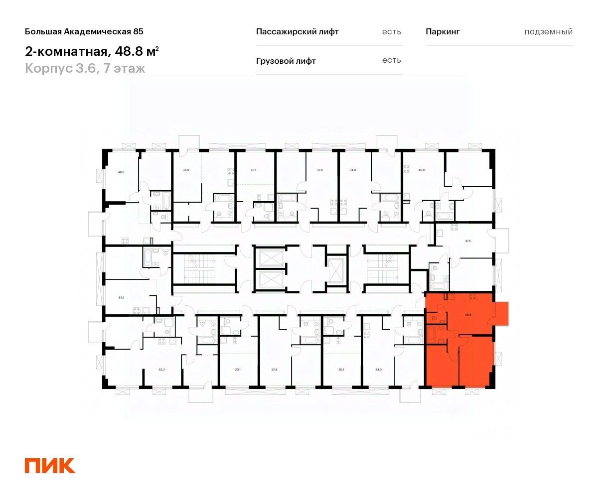 Продаётся 2-комн. апартаменты площадью 48,8 кв.м на 7 этаже 24 этажного дома (Корпус 3.6, Секция 2) проекта ПИК Большая Академическая 85. Светлый просторный подъезд на уровне земли, функциональная планировка, большие окна, c отделкой.