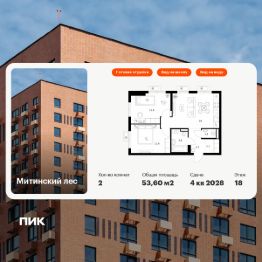 Продаётся 2-комн. квартира площадью 53,6 кв.м на 18 этаже 27 этажного дома (Корпус 14, Секция 5) проекта ПИК Митинский лес. Светлый просторный подъезд на уровне земли, функциональная планировка, большие окна, c отделкой.