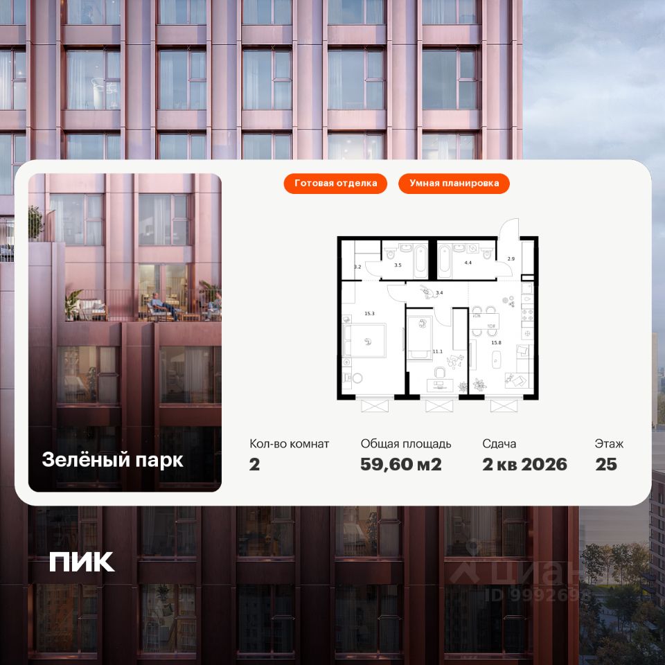 Продаётся 2-комн. квартира площадью 59,6 кв.м на 25 этаже 25 этажного дома (Корпус 6.4, Секция 4) проекта ПИК Зелёный парк. Светлый просторный подъезд на уровне земли, функциональная планировка, большие окна, c отделкой.