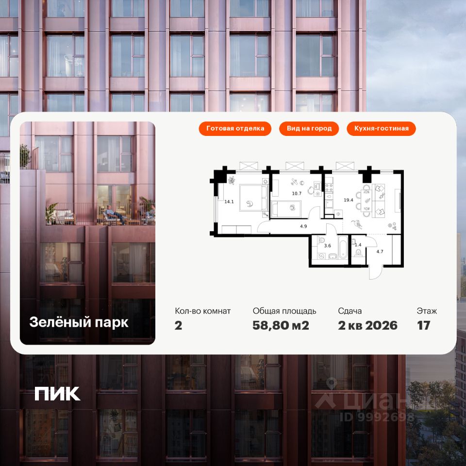 Продаётся 2-комн. квартира площадью 58,8 кв.м на 17 этаже 25 этажного дома (Корпус 6.2, Секция 1) проекта ПИК Зелёный парк. Светлый просторный подъезд на уровне земли, функциональная планировка, большие окна, c отделкой.