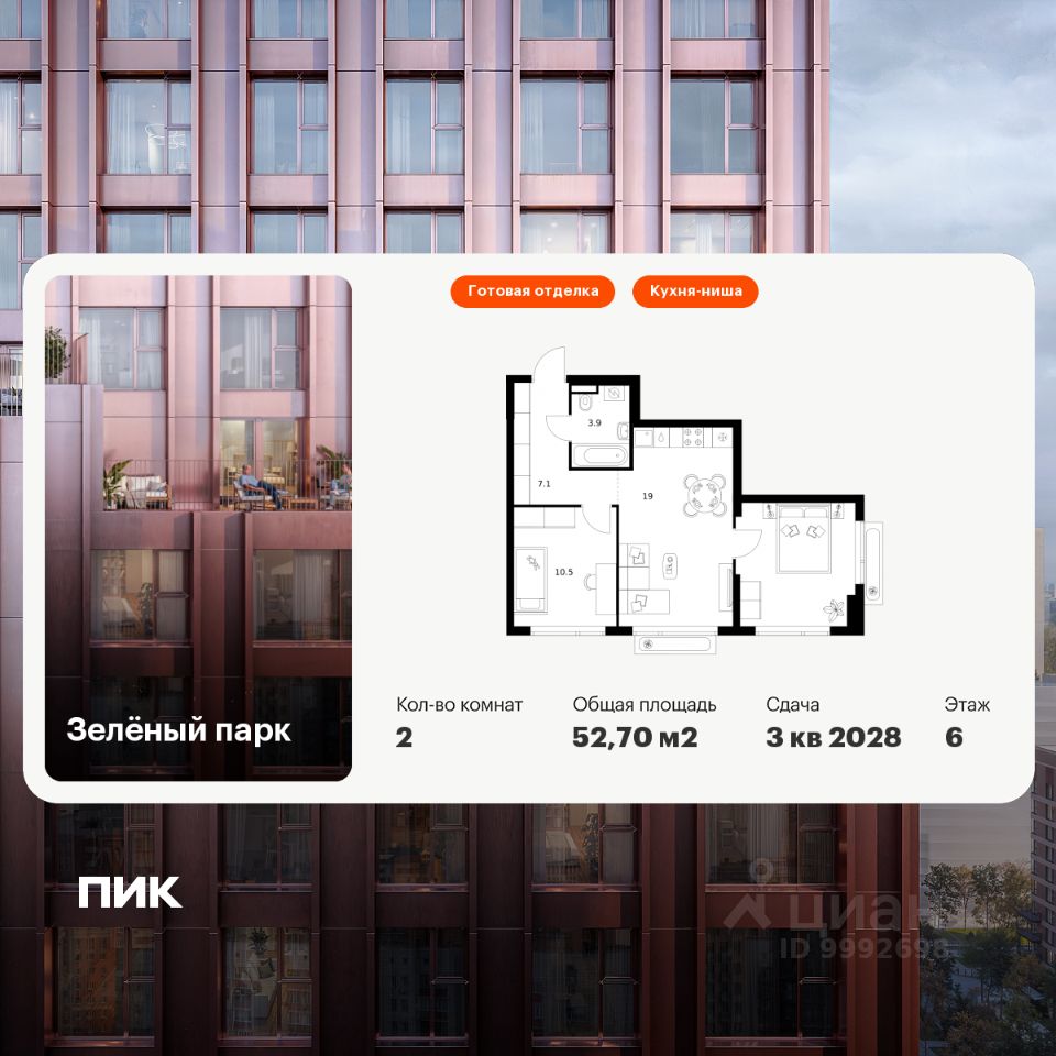 Продаётся 2-комн. квартира площадью 52,7 кв.м на 6 этаже 21 этажного дома (Корпус 5.2, Секция 1) проекта ПИК Зелёный парк. Светлый просторный подъезд на уровне земли, функциональная планировка, большие окна, c отделкой.