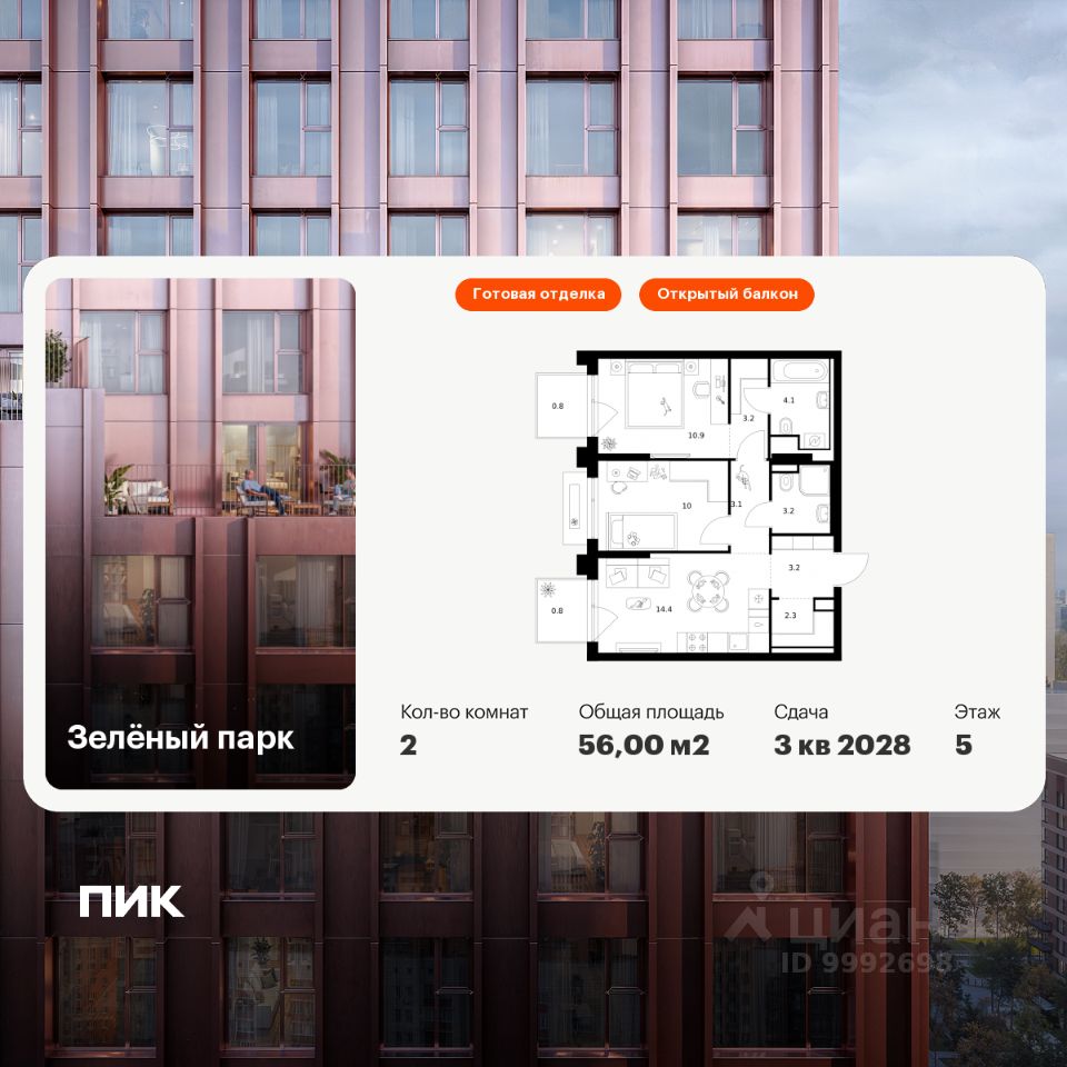 Продаётся 2-комн. квартира площадью 56 кв.м на 5 этаже 13 этажного дома (Корпус 5.3, Секция 3) проекта ПИК Зелёный парк. Светлый просторный подъезд на уровне земли, функциональная планировка, большие окна, c отделкой.