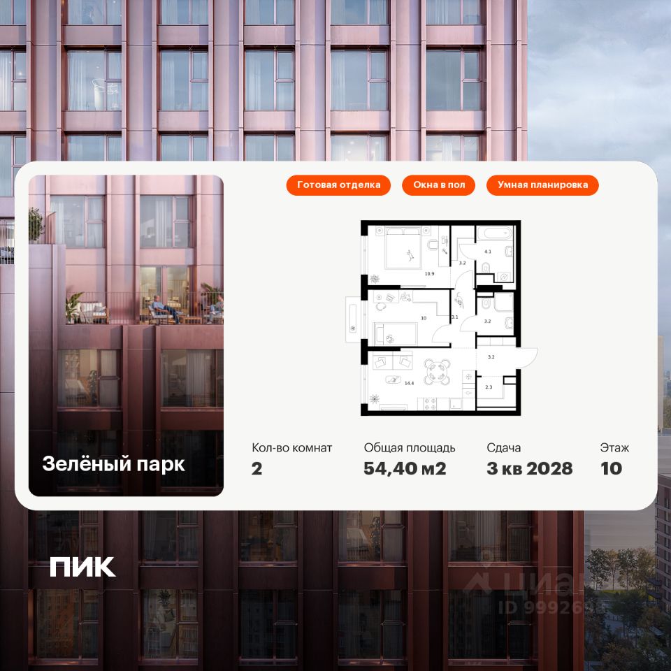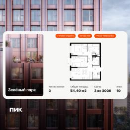 Продаётся 2-комн. квартира площадью 54,4 кв.м на 10 этаже 13 этажного дома (Корпус 5.3, Секция 3) проекта ПИК Зелёный парк. Светлый просторный подъезд на уровне земли, функциональная планировка, большие окна, c отделкой.