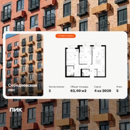 Продаётся 2-комн. квартира площадью 62,4 кв.м на 5 этаже 16 этажного дома (Корпус 2.1.4, Секция 4) проекта ПИК Середневский лес. Светлый просторный подъезд на уровне земли, функциональная планировка, большие окна, c отделкой.