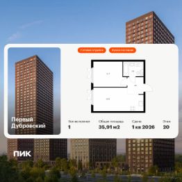 Продаётся 1-комн. квартира площадью 35,91 кв.м на 20 этаже 38 этажного дома (Корпус 1.4, Секция 2) проекта ПИК Первый Дубровский. Светлый просторный подъезд на уровне земли, функциональная планировка, большие окна, c отделкой.
