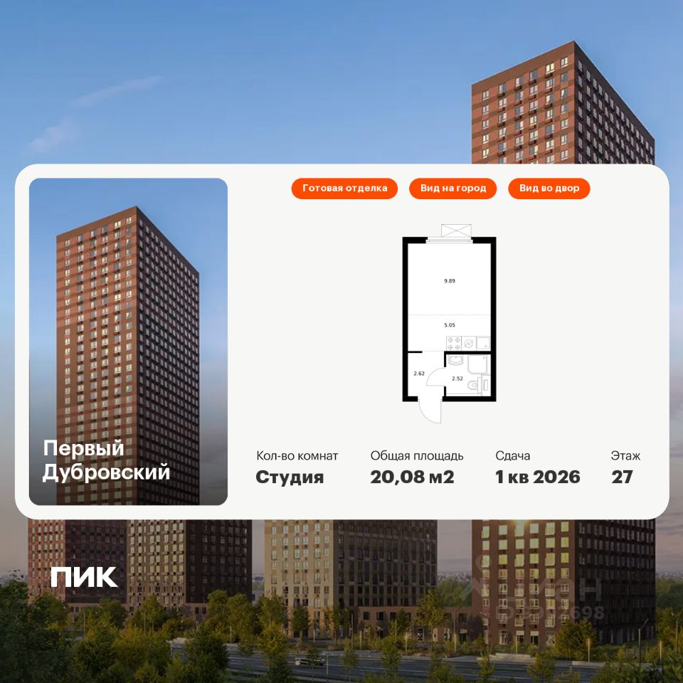 Продаётся квартира-студия площадью 20,08 кв.м на 27 этаже 33 этажного дома (Корпус 1.3, Секция 1) проекта ПИК Первый Дубровский. Светлый просторный подъезд на уровне земли, функциональная планировка, большие окна, c отделкой.